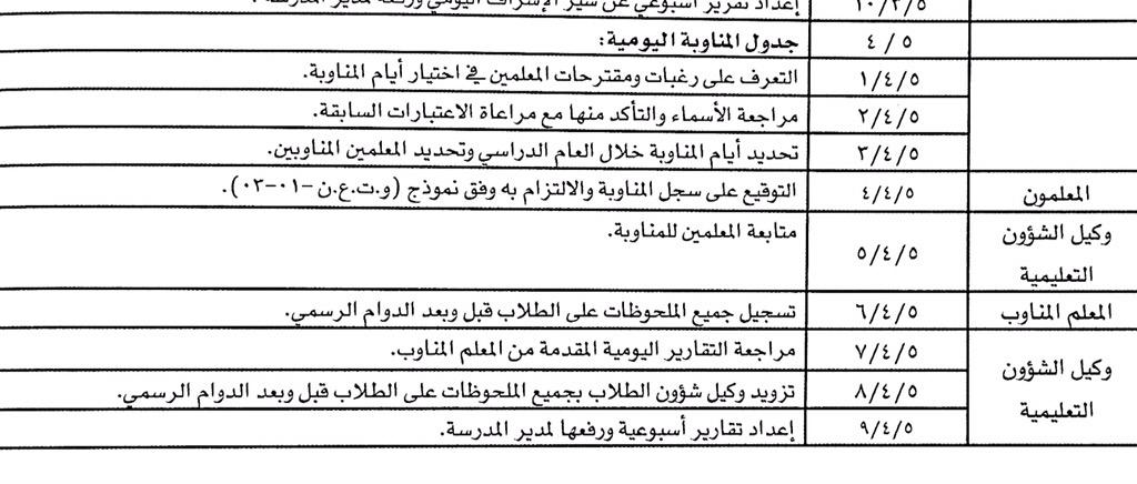 مهام المناوبة اليومية في المدرسة المرسال