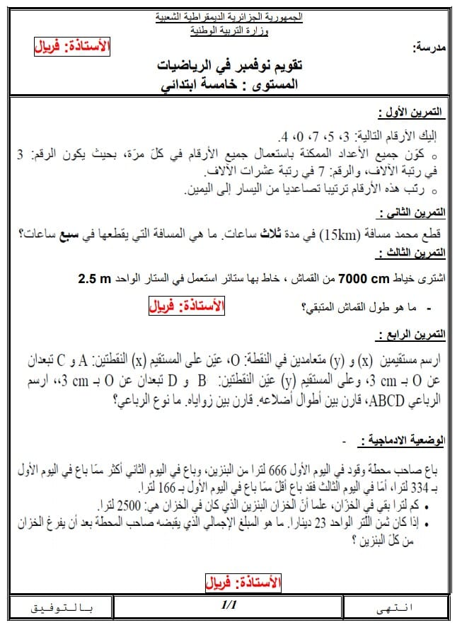 تقويم رياضيات شهر نوفمبر السنة الخامسة ابتدائي